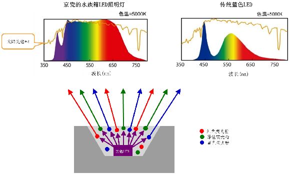 京瓷株式會(huì)社開發(fā)出適用于水族箱的全光譜 LED 照明燈。京瓷的高顯色LED照明燈利用其自行研發(fā)的技術(shù),將紫色LED和RGB三原色(紅/綠/藍(lán)色)熒光體組合在一起,可營造出自然光照射到特定水下深度的效果,能模擬出接近珊瑚和水生植物自然棲息地的光線,適合不同水生生物的生長。光學(xué)光譜也可以進(jìn)行定制,可營造出適合觀賞的深藍(lán)色。