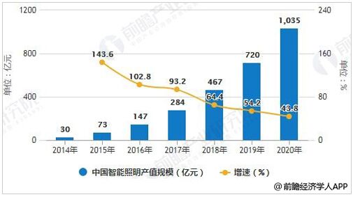 2014-2020年中國智能照明產(chǎn)值規(guī)模統(tǒng)計及增長情況預(yù)測