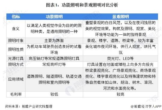 功能照明和景觀照明為我國照明工程兩大市場 照明工程行業(yè)主要可分為功能照明和景觀照明,由于目的性不同,兩大細分市場在照明對象、照明性質(zhì)、光源燈具和照明方式等均有所不同,在應(yīng)用領(lǐng)域也各有側(cè)重。 具體來看,功能照明以滿足人類視覺作業(yè)為主要目的,因此其應(yīng)用領(lǐng)域主要為道路照明、隧道照明、軌道交通照明和室內(nèi)照明等,行業(yè)毛利率較低;而景觀照明主要以重塑景觀的白日風(fēng)范,以及呈現(xiàn)美的視覺效果為目的,具備觀賞和美化環(huán)境的作用,因此其應(yīng)用場景主要為橋梁景觀亮化、廣場景觀亮化、商場景觀亮化、樓宇景觀亮化以及特殊建筑物和特殊自然載體如山體、胡泊、樹木、溶洞、河流和水面亮化等。