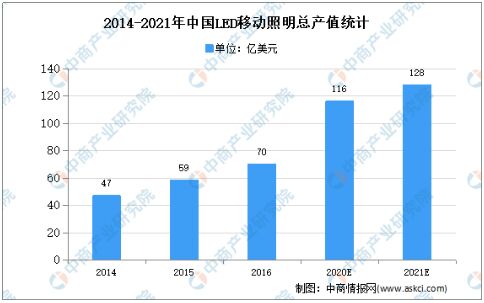 移動(dòng)照明,又稱作便攜式照明,指體積小、重量輕,具備一定移動(dòng)性的照明產(chǎn)品,一般為手持式的電子照明工具,屬于照明行業(yè)的一個(gè)分支。近年來,我國移動(dòng)照明產(chǎn)業(yè)始終保持穩(wěn)定發(fā)展態(tài)勢,總產(chǎn)值穩(wěn)定上漲。數(shù)據(jù)顯示,我國LED移動(dòng)照明產(chǎn)品總產(chǎn)值已從2011年的24.80億美元,逐步增長至2016年的70.02億美元,年均復(fù)合增長率為23.07%。中商產(chǎn)業(yè)研究院預(yù)測,2021年我國LED移動(dòng)照明總產(chǎn)值將達(dá)128億美元。
