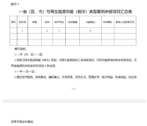 1.××。▍^(qū)、市)可再生能源供暖(制冷)典型案例申報(bào)項(xiàng)目匯總表