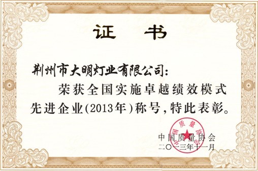 2013年11月3日,第十三屆全國追求卓越大會頒獎典禮在北京京西賓館順利召開,荊州市大明燈業(yè)有限公司榮獲全國實(shí)施卓越績效模式先進(jìn)企業(yè)稱號,成為荊州市此次唯一受到該項(xiàng)表彰的企業(yè)。 荊州市大明燈業(yè)有限公司是一家以生產(chǎn)各類照明產(chǎn)品的高新技術(shù)企業(yè)。自導(dǎo)入卓越績效模式以來,大明燈業(yè)一直致力于技術(shù)水平和管理水平的提升,通過學(xué)習(xí)和時間卓越績效模式,積極探索,開拓創(chuàng)新,經(jīng)過不懈努力,取得了顯著成效。此次獲得該榮譽(yù),代表著大明燈業(yè)的管理水平已經(jīng)達(dá)到了一個新的高度,極大地促進(jìn)了企業(yè)的經(jīng)營質(zhì)量水平和綜合競爭能力,樹立了全國實(shí)施卓越績效模式的先進(jìn)典型。 在此次表彰后企業(yè)會堅(jiān)持持續(xù)改進(jìn),努力超越自我,不斷提高產(chǎn)品、服務(wù)和經(jīng)營質(zhì)量,增強(qiáng)核心競爭力,繼續(xù)為提高我國的綜合國力做出貢獻(xiàn)。