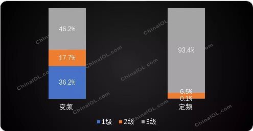 2018年中國國內(nèi)定變頻空調(diào)能效等級結(jié)構(gòu)分布(%)
