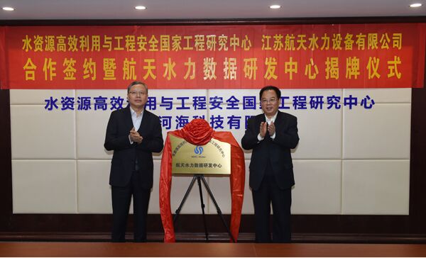 12月28日,水資源高效利用與工程安全國(guó)家工程研究中心與江蘇航天水力設(shè)備有限公司舉行合作簽約暨航天水力數(shù)據(jù)研發(fā)中心揭牌儀式。中國(guó)航天科技集團(tuán)科技委副主任、航天六院科技委主任譚永華,江蘇航天水力設(shè)備有限公司總經(jīng)理李彥喜、副總經(jīng)理邵春兵,河海大學(xué)校長(zhǎng)徐輝,河海大學(xué)副校長(zhǎng)、水資源高效利用與工程安全國(guó)家工程研究中心主任鄭金海等出席儀式。徐輝校長(zhǎng)與譚永華主任共同為航天水力數(shù)據(jù)研發(fā)中心揭牌,水資源高效利用與工程安全國(guó)家工程研究中心常務(wù)副主任陳達(dá)與李彥喜總經(jīng)理簽署合作協(xié)議。鄭金海副校長(zhǎng)主持儀式。