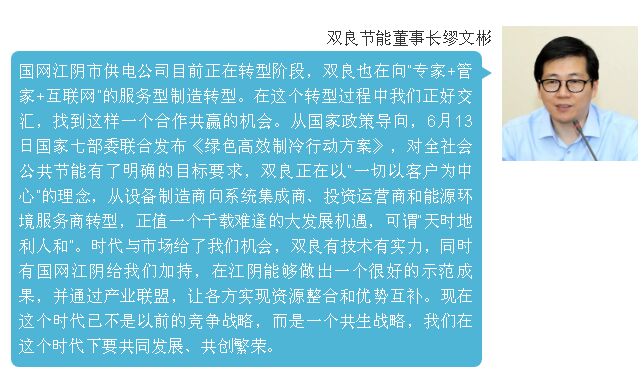 雙方合作旨在共同建設(shè)以能源高效互聯(lián)、用戶友好交互(涵蓋政府機(jī)構(gòu)、能源服務(wù)商、企業(yè)和電網(wǎng))的江陰能源互聯(lián)網(wǎng)云平臺。依托能源互聯(lián)網(wǎng)平臺,雙良節(jié)能將優(yōu)化的節(jié)能設(shè)計(jì)方案和自身核心技術(shù)集成與國網(wǎng)江陰市供電公司及下屬企業(yè)參與的節(jié)能系統(tǒng)規(guī)劃設(shè)計(jì)、設(shè)備集成及系統(tǒng)建設(shè)進(jìn)行融合。 基于各自的技術(shù)優(yōu)勢與資源優(yōu)勢,雙方將在江陰市內(nèi),就新建及改造的工商業(yè)公共事業(yè)項(xiàng)目中暖通節(jié)能減排等綜合能源服務(wù)領(lǐng)域開展長期的、全面的戰(zhàn)略合作,并建立密切的合作伙伴關(guān)系,打造共贏、可持續(xù)發(fā)展的戰(zhàn)略合作伙伴關(guān)系,共同建立和推行建筑暖通領(lǐng)域里的節(jié)能運(yùn)營托管(OC)、合同能源管理(EMC)、暖通配套工程總承包(EPC)和工程總承包+運(yùn)營托管(EPC+C)等多方位節(jié)能領(lǐng)域的合作機(jī)制與商業(yè)模式的創(chuàng)新。