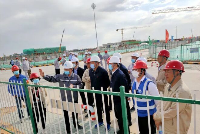 國電電力集團領導到國電雙維電廠現(xiàn)場檢查工作,劉國銀總經(jīng)理在現(xiàn)場介紹雙良的鋼塔項目。