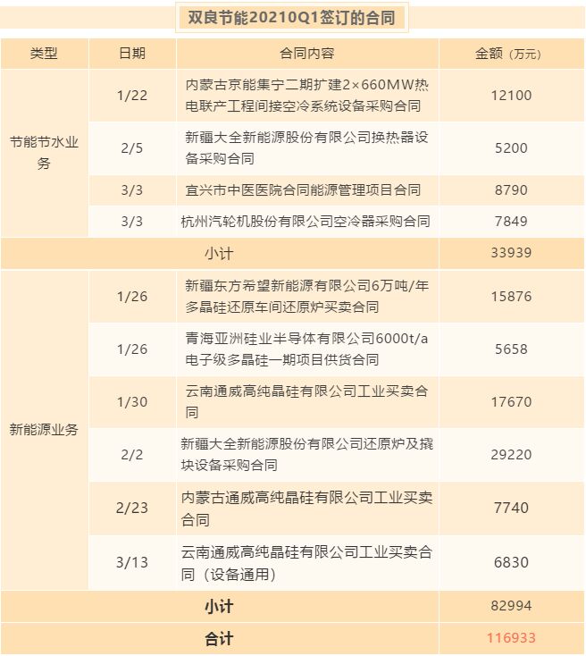 4月19日,雙良節(jié)能發(fā)布了2021年一季度報告,公告顯示,一季度實現(xiàn)營業(yè)收入4.34億元,同比增長97.37%;凈利潤2742萬元,同比增長198.98%。利潤增長主要系公司強化精細(xì)化管理,增強市場意識,抓住了市場機遇,有效地提升了企業(yè)經(jīng)營業(yè)績。 一季度業(yè)績創(chuàng)近五年新高 雙良節(jié)能一季報顯示,實現(xiàn)營業(yè)收入4.34億元,同比增長97.37%;凈利潤2742萬元,同比增長198.98%。與此同時,2021年一季度與2019年一季度相比,營收增長24%,凈利潤增長達(dá)161%。 隨著疫情的緩解,雙良節(jié)能業(yè)務(wù)改善非常明顯,這也一定程度上表明了公司不僅經(jīng)營快速恢復(fù),而且其戰(zhàn)略規(guī)劃、產(chǎn)品、模式上的轉(zhuǎn)型也取得了突破性的進(jìn)展。今年一季度營收和凈利潤均創(chuàng)近五年的新高,給市場交出了一份令人驚喜的成績單。 節(jié)能減排和新能源齊頭并進(jìn) 近期,雙良節(jié)能頻頻公告大額訂單,從溴化鋰熱泵到空冷系統(tǒng),再到多晶硅還原爐,從余熱利用到循環(huán)水冷卻,再到光伏新能源,無一不是在助推“碳達(dá)峰、碳中和”目標(biāo)的實現(xiàn),而“碳達(dá)峰、碳中和”政策也將進(jìn)一步提升節(jié)能減排和光伏新能源的業(yè)務(wù)需求。 數(shù)據(jù)顯示,公司自2020年起公告的訂單合同累計近33億元。其中,今年一季度公告的訂單合同金額高達(dá)11.69億元,一季度節(jié)能節(jié)水業(yè)務(wù)占3.39億元;一季度新能源業(yè)務(wù)占8.30億元。 這意味著,雙良節(jié)能基本實現(xiàn)了雙輪驅(qū)動,節(jié)能減排和新能源兩大板塊業(yè)務(wù)齊頭共進(jìn)。隨著交付緊密期的臨近、經(jīng)營旺季的來臨,未來公司的業(yè)績將明顯得到提升。