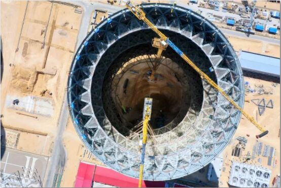 5月1日,勞動者的節(jié)日,內(nèi)蒙古鄂爾多斯草原上風和日麗,這是特別值得慶祝的一天——在國家能源集團上海廟項目建設(shè)現(xiàn)場,由雙良冷卻公司EPC承建的#3鋼結(jié)構(gòu)間接空冷塔順利封頂。目前國能上海廟電廠二期間冷塔主體結(jié)構(gòu)工程總體進度已完成過半,#3機組間接空冷系統(tǒng)設(shè)備安裝完成后很快就將進入168試運行階段。
