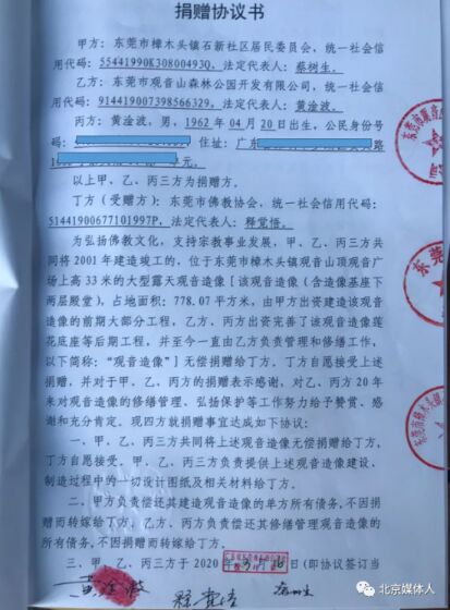 觀音像在2001年開完光以后,黃淦波就寫了一個捐贈書給東莞市民宗局,大概內(nèi)容是說觀音像建好了,開完光了,觀音寺也得到批復(fù)可以重建。觀音山公園主動把這些財(cái)產(chǎn)捐給東莞市佛j協(xié)會,特此為證,簽了名蓋了章送到東莞市民宗局——可惜此文件據(jù)說已找不到。2007年,胡某棋又勒令黃淦波簽署一份類似的捐贈協(xié)議,此協(xié)議有文本仍在,可查,但胡某棋說不承認(rèn)有此事。