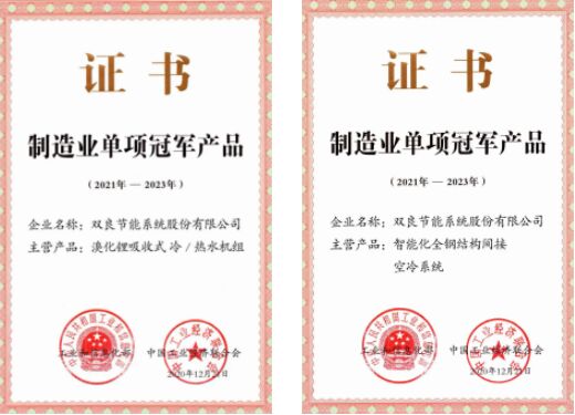 雙良溴化鋰吸收式冷/溫水機組、智能化全鋼結構間接空冷系統(tǒng),榮獲由工信部、中國工業(yè)經(jīng)濟聯(lián)合會共同頒發(fā)的“中國制造業(yè)單項冠軍產(chǎn)品”證書。