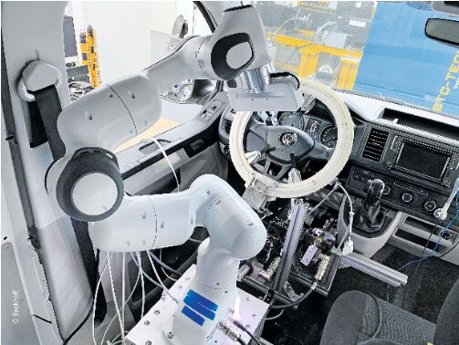 在試驗(yàn)期間,車輛會(huì)在真實(shí)的路面駕駛條件下進(jìn)行模擬。駕駛試驗(yàn)臺(tái)會(huì)根據(jù)仿真轉(zhuǎn)矩轉(zhuǎn)動(dòng)車輪,甚至可以模擬車輪轉(zhuǎn)向運(yùn)動(dòng)。這種仿真試驗(yàn)真實(shí)度極高,可以使用相應(yīng)的執(zhí)行機(jī)構(gòu)仿真駕駛員的動(dòng)作。大部分動(dòng)作由工業(yè)機(jī)器人執(zhí)行,以完成盡可能多的不同動(dòng)作。試驗(yàn)臺(tái)還可以模擬現(xiàn)實(shí)環(huán)境,以及車輛如何與周圍環(huán)境進(jìn)行通信(例如通過 GPS 系統(tǒng))?掀针鴳(yīng)用技術(shù)大學(xué)除了成功開發(fā)試驗(yàn)臺(tái)之外,還為系統(tǒng)打造了一個(gè)數(shù)字孿生平臺(tái)。這不僅有利于實(shí)現(xiàn)試驗(yàn)臺(tái)的預(yù)試車,而且還能夠?qū)崿F(xiàn)全面的系統(tǒng)可視化和監(jiān)測(cè)。
