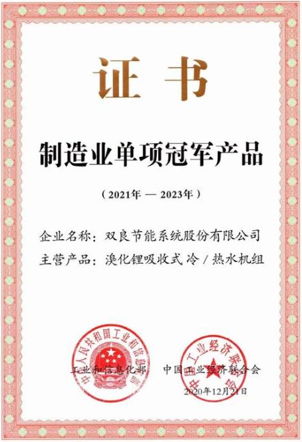 雙良溴化鋰吸收式冷 / 溫水機(jī)組榮獲由工信部、中國(guó)工業(yè)經(jīng)濟(jì)聯(lián)合會(huì)共同頒發(fā)的“ 中國(guó)制造業(yè)單項(xiàng)冠軍產(chǎn)品 ”證書(shū)。