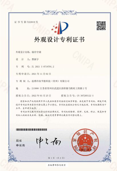 值得一提的是,泓博科技擁有經(jīng)驗豐富的研發(fā)團隊、專業(yè)的工程方案設(shè)計團隊,其研發(fā)設(shè)計的制冷空調(diào),榮獲國家外觀設(shè)計專利證書。