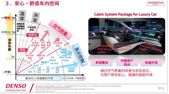 延伸至汽車座艙領(lǐng)域,電裝希望通過人性化的顯示設(shè)置、提供優(yōu)質(zhì)空氣,創(chuàng)造出令人安心舒適的車內(nèi)空間;運用AI系統(tǒng)預(yù)測危險場景、在不過度干擾駕駛的狀態(tài)下通過HUD、液晶儀表等顯示設(shè)備向駕駛員提供信息,進而消除交通事故實現(xiàn)自由出行!半娧b的目的是運用豐富的經(jīng)驗和技術(shù),通過系統(tǒng)整合最終實現(xiàn)便利性、舒適性和美感三大價值!鄙蹠F說。