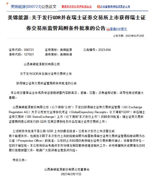 2月20日,美錦能源發(fā)布公告稱:公司于近日獲得瑞士證券交易所監(jiān)管局關(guān)于公司發(fā)行全球存托憑證(GDR)并在瑞士證券交易所上市的附條件批準(zhǔn),瑞士證券交易所監(jiān)管局同意公司發(fā)行的GDR在滿足慣例性條件后在瑞士證券交易所上市。