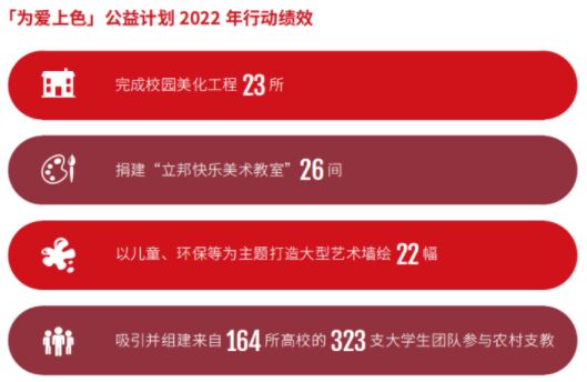 立邦「為愛上色」項目自2009年發(fā)起運營至今,持續(xù)通過校園環(huán)境美化、美術(shù)教室捐贈、藝術(shù)家墻繪創(chuàng)作、農(nóng)村支教等行動為世界帶去愛、色彩與歡樂。去年,立邦「為愛上色」成績突出:為23所校園進行彩色涂刷,累計共為406所鄉(xiāng)村學(xué)校刷新校園空間。捐贈26間學(xué)校美術(shù)教室,累計共捐建390間“立邦快樂美術(shù)教室”以支持鄉(xiāng)村美術(shù)教育發(fā)展。創(chuàng)作22幅大型墻繪,累計共創(chuàng)作214幅墻繪創(chuàng)作,助力將藝術(shù)和色彩融入當(dāng)?shù)匚幕y手“知行計劃”繼續(xù)開展中國大學(xué)生農(nóng)村支教獎,來自164所高校大學(xué)生團隊報名參與,開展支教活動2,112+天,惠及4,0000+名鄉(xiāng)村師生。