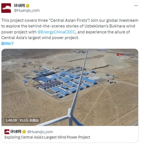 2013年9月,共建絲綢之路經(jīng)濟(jì)帶重大倡議提出,至今已整十年。在這重要歷史節(jié)點,環(huán)球網(wǎng)聯(lián)合中國能建于北京時間9月25日16:00策劃了“風(fēng)起絲路,電連天涯:探秘中亞第一大風(fēng)力發(fā)電項目”海外直播活動,通過臉書、推特等海外社交媒體平臺,帶領(lǐng)全球觀眾一起聆聽烏茲別克斯坦布哈拉風(fēng)電項目建設(shè)的幕后故事,近距離感受中國企業(yè)為推動世界綠色低碳發(fā)展做出的切實行動,見證“一帶一路”上建設(shè)者們的風(fēng)采。