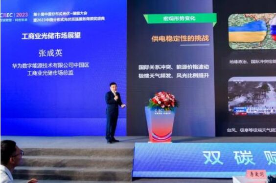 在第十屆中國分布式光伏+儲(chǔ)能論壇上,華為數(shù)字能源中國區(qū)智能光伏工商業(yè)光儲(chǔ)市場(chǎng)總監(jiān)張成英分享了《工商業(yè)光儲(chǔ)市場(chǎng)展望-光儲(chǔ)融合全面智能》,介紹了宏觀形勢(shì)、政策、市場(chǎng)熱點(diǎn)的變化,并對(duì)工商業(yè)光伏、儲(chǔ)能、光儲(chǔ)融合、BIPV等幾個(gè)場(chǎng)景的技術(shù)發(fā)展趨勢(shì)進(jìn)行了洞察。