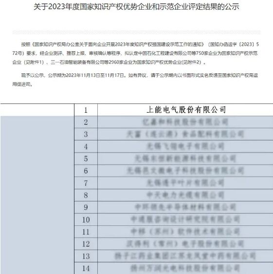 近日,國(guó)家知識(shí)產(chǎn)權(quán)局公布2023年度國(guó)家知識(shí)產(chǎn)權(quán)優(yōu)勢(shì)企業(yè)和示范企業(yè)評(píng)定結(jié)果,上能電氣股份有限公司憑借其精益生產(chǎn)管理、優(yōu)質(zhì)知識(shí)產(chǎn)權(quán)創(chuàng)新和卓越的全球影響力,榮獲“國(guó)家知識(shí)產(chǎn)權(quán)優(yōu)勢(shì)企業(yè)”榮譽(yù)。