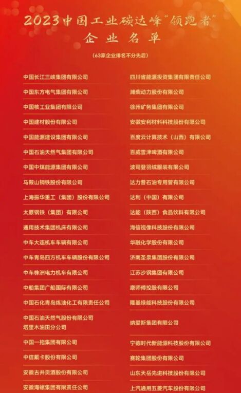 2023中國(guó)工業(yè)碳達(dá)峰“領(lǐng)跑者”企業(yè)名單