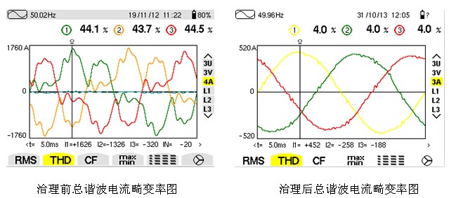 采用四套容量為100A追日電氣ZAPF三相四線有源濾波器來濾除系統(tǒng)諧波,實(shí)時(shí)檢測(cè)電網(wǎng)中由非線性負(fù)載產(chǎn)生的電流波形,動(dòng)態(tài)生成反向諧波電流,用以補(bǔ)償負(fù)載諧波電流。
