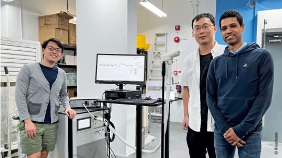Breathonix 團隊與 Ionicon 公司的 PTR-TOF 分析儀合影:新加坡研究人員使用專用的軟件處理新冠病毒呼氣檢測的分析數據,一分鐘就能出結果。