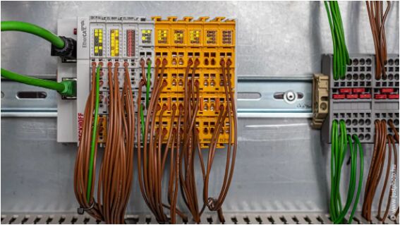 EtherCAT 和 TwinSAFE 端子模塊安裝在控制柜中,用于控制管弦樂池