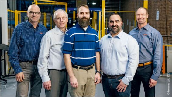 自動化技術(shù)和機(jī)器人專家們在波士頓動力公司的測試中心:(左起)倍福內(nèi)部物流行業(yè)應(yīng)用專家 Gilbert Petersen;倍福區(qū)域銷售經(jīng)理 Brian Buck;波士頓動力公司 Stretch 硬件技術(shù)總監(jiān) Matthew Meduna;波士頓動力公司供應(yīng)鏈總監(jiān) Eric Landry;以及倍福全球物料搬運(yùn)和內(nèi)部物流行業(yè)經(jīng)理 Doug Schuchart