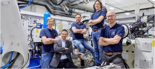 向器生產(chǎn)設(shè)計和自動化試驗臺:聲學(xué)專家 Julius Ellmann、電氣工程師 Michael Sauerwein 和軟件專家 Karsten Mauersberger。在兩者之間(左二):瑞士倍福分公司銷售工程師 Maurus Kaelin