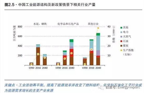 中國日益增長的能源需求正越來越多地依賴可再生能源、天然氣和電力;而煤炭需求有所回落。電力和可再生能源需求的增長與中國能源結(jié)構(gòu)的多樣化和清潔化密切相關(guān)。到2040年,煤炭在總發(fā)電量中所占份額將從2016年的三分之二降到40%以下。電力和天然氣需求的增長與工業(yè)和民用部門是密切相關(guān)的,因為這些能源滿足了輕工業(yè)部門的能源需求又契合了人們對空氣質(zhì)量日益增長的要求。中國還將生物質(zhì)能應(yīng)用到工業(yè)中,將太陽能用于供暖以及運用生物燃料運輸,從而增加終端消費行業(yè)對可再生能源的直接利用。到2040年,電力將在中國的終端能源消費中占據(jù)主導地位,到21世紀20年代后期超過煤炭,此后不久將會超過石油。到2040年,天然氣需求量將上升到6000億立方米以上,使中國成為僅次于美國的全球第二大天然氣市場,也是全球天然氣需求增長的最主要來源:在此期間,天然氣在中國主要能源結(jié)構(gòu)中的份額將從不到6%上升至12%以上。與此同時,隨著燃煤發(fā)電的發(fā)電量達到峰值,以及重工業(yè)用煤和居民供熱用煤出現(xiàn)結(jié)構(gòu)性下滑,中國的煤炭需求最終將遠低于2016年的水平。煤炭在中國一次能源結(jié)構(gòu)中的份額將縮減20個百分點,到2040年約為45%。
