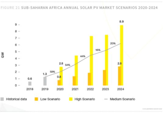 盡管COVID-19疫情給非洲地區(qū)的經(jīng)濟(jì)帶來(lái)了難以估量的影響,但是南非依舊是撒哈拉以南地區(qū)最大的光伏市場(chǎng)。由于電力需求大幅下降(25-40%),一些小型的獨(dú)立電廠項(xiàng)目(IPPs)受疫情挫敗嚴(yán)重。好在,最近一些關(guān)于可再生能源的政治承諾和極具吸引力的監(jiān)管框架,預(yù)計(jì)將推動(dòng)多個(gè)較小的國(guó)家大力發(fā)展光伏發(fā)電,每年新增數(shù)百兆瓦容量,比如贊比亞、埃塞俄比亞、津巴布韋和尼日利亞。