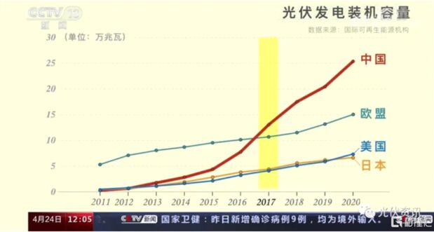 2011年,中國的裝機容量僅為日本、美國的六成,為歐盟的6%。從2013年起,國家加大節(jié)能減排力度,光伏產業(yè)快速發(fā)展。到2017年,中國的裝機容量就超過了整個歐盟的總和。