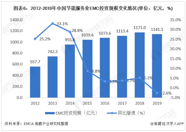 隨著國(guó)內(nèi)節(jié)能服務(wù)業(yè)的迅猛發(fā)展,節(jié)能服務(wù)業(yè)合同能源管理(EMC)項(xiàng)目投資也迅速增長(zhǎng)。2012-2018年,EMC投資規(guī)模維持增長(zhǎng)趨勢(shì),投資增速有所下降。2019年我國(guó)合同能源管理投資實(shí)現(xiàn)2.6%的負(fù)增長(zhǎng),達(dá)到1141.1億元。