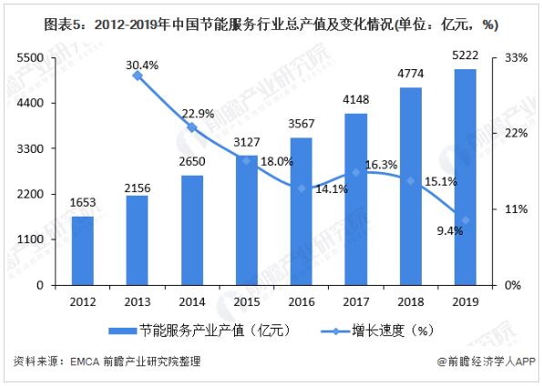 2019年EMCA的數(shù)據(jù)顯示,我國(guó)節(jié)能服務(wù)產(chǎn)業(yè)總產(chǎn)值從2012年的1653億元增長(zhǎng)到2019年5222億元,增長(zhǎng)速度持續(xù)下降。近幾年來(lái),我國(guó)節(jié)能服務(wù)產(chǎn)業(yè)利好政策頻發(fā),加上國(guó)家對(duì)節(jié)能環(huán)保的重視程度不斷加深。從長(zhǎng)遠(yuǎn)來(lái)看,未來(lái)隨著節(jié)能服務(wù)產(chǎn)業(yè)規(guī)模的不斷擴(kuò)大,其發(fā)展速度將隨著行業(yè)不斷的接近飽和發(fā)展而放緩,到2025年,全國(guó)節(jié)能服務(wù)產(chǎn)業(yè)總產(chǎn)值將約達(dá)到8080億元。