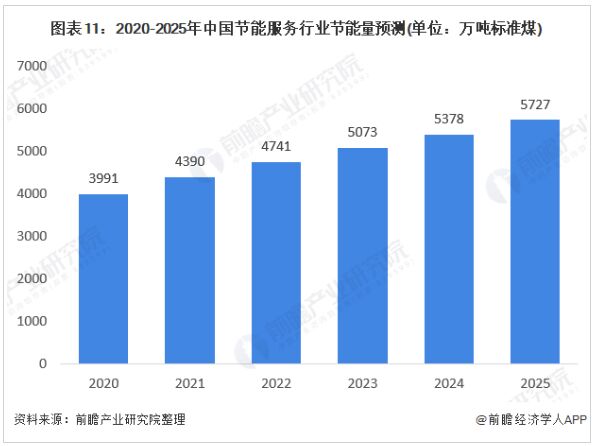 2017年1月,國(guó)務(wù)院印發(fā)《“十三五”節(jié)能減排綜合工作方案》,到2020年,全國(guó)萬(wàn)元國(guó)內(nèi)生產(chǎn)總值能耗比2015年下降15%,能源消費(fèi)總量控制在50億噸標(biāo)準(zhǔn)煤以內(nèi)。全國(guó)化學(xué)需氧量、氨氮、二氧化硫、氮氧化物排放總量分別控制在2001萬(wàn)噸、207萬(wàn)噸、1580萬(wàn)噸、1574萬(wàn)噸以內(nèi),比2015年分別下降10%、10%、15%和15%。全國(guó)揮發(fā)性有機(jī)物排放總量比2015年下降10%以上。 “十三五”結(jié)束后馬上迎來(lái)“十四五”,節(jié)能作為國(guó)家長(zhǎng)期發(fā)展方針,前瞻認(rèn)為國(guó)家對(duì)能源消耗的控制力度將越來(lái)越大,結(jié)合節(jié)能創(chuàng)新能力的提高,節(jié)能服務(wù)行業(yè)的節(jié)能能力也將隨之加強(qiáng)。2019年EMCA的數(shù)據(jù)顯示,我國(guó)節(jié)能服務(wù)產(chǎn)業(yè)節(jié)能能力從2012年1774.46萬(wàn)噸標(biāo)準(zhǔn)煤增長(zhǎng)到3801萬(wàn)噸標(biāo)準(zhǔn)煤。預(yù)計(jì)在2025年,我國(guó)節(jié)能服務(wù)產(chǎn)業(yè)節(jié)能能力將超過(guò)5727萬(wàn)噸標(biāo)準(zhǔn)煤。