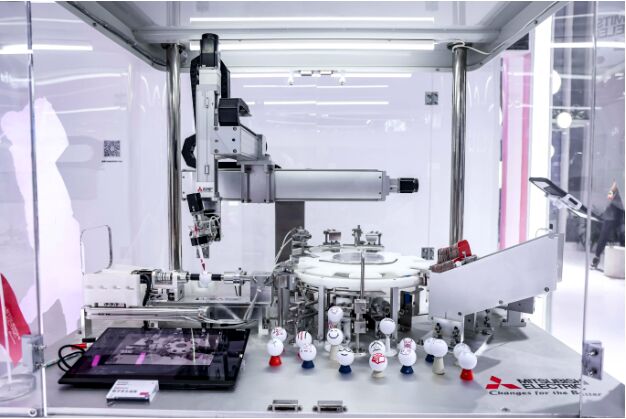 此次參展,三菱電機(jī)帶來了多項(xiàng)科技感和趣味性十足的打卡互動(dòng)體驗(yàn),吸引了大批觀眾駐足,最吸睛的莫過于高爾夫球繪圖包裝展機(jī)。通過五軸聯(lián)動(dòng)運(yùn)行、二維平面轉(zhuǎn)換三維球面軌跡算法、數(shù)字孿生等核心技術(shù),機(jī)械控制臂可在半徑為21.3mm的高爾夫球面進(jìn)行精細(xì)繪畫,不到2分鐘即可完成高爾夫球上的繪畫與制盒包裝,引發(fā)現(xiàn)場(chǎng)陣陣驚嘆。三菱電機(jī)通過生動(dòng)形象的方式,將自己的高精密智能制造能力完美展現(xiàn)。