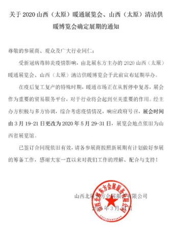 根據(jù)新型肺炎疫情防控需要,為貫徹落實(shí)黨中央和山西省政府做好新型冠狀病毒感染的肺炎疫情防控工作,切實(shí)保障廣大參展商和觀眾及各界朋友們的健康安全,確保參展企業(yè)的參展效果和采購(gòu)商的參觀體驗(yàn),原定于3月19-21日在山西舉辦的2020山西(太原)暖通展覽會(huì)延期至5月29-31日舉辦。