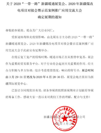 親愛的參展商及觀眾: 2020“一帶一路”新疆暖通展覽會(huì)、2020年新疆煤改電項(xiàng)目對(duì)接會(huì)暨示范案例推廣應(yīng)用交流大會(huì),現(xiàn)確定最新展期時(shí)間為2020年6月28日-30日,展覽會(huì)地點(diǎn)依舊為新疆國(guó)際會(huì)展中心。 在過去的兩個(gè)月里,中華民族經(jīng)歷了一場(chǎng)自新中國(guó)成立以來,感染范圍最廣、轉(zhuǎn)播速度最快、防治難度最大的一次疫情。這是一場(chǎng)沒有硝煙的重大衛(wèi)生戰(zhàn)役,新型肺炎疫情發(fā)生以來,全國(guó)上下眾志成城、萬(wàn)眾一心,采取個(gè)各種“硬核”措施防止疫情擴(kuò)散蔓延,以責(zé)任和擔(dān)當(dāng)筑起了疫情防控長(zhǎng)城堤壩。從疫情爆發(fā)到控制疫情的關(guān)鍵到目前分級(jí)防控精準(zhǔn)防控等疫情特殊時(shí)期,新疆暖通展隔離病毒隔離疫情,卻不曾隔離服務(wù),不曾隔離構(gòu)筑祖國(guó)碧水藍(lán)天中國(guó)夢(mèng)的初心!新疆暖通展雖不在抗疫一線,但祖國(guó)的大好山河,碧水藍(lán)天,卻不能離線!2020"一帶一路"新疆暖通展覽會(huì)、2020年新疆煤改電項(xiàng)目對(duì)接會(huì)暨示范案例推廣應(yīng)用交流大會(huì)將于6月28-30日在新疆國(guó)際會(huì)展中心盛大舉辦,為中國(guó)生態(tài)環(huán)境建設(shè)作出積極貢獻(xiàn),為市政、工業(yè)、農(nóng)村清潔供暖工作提供最佳解決方案!