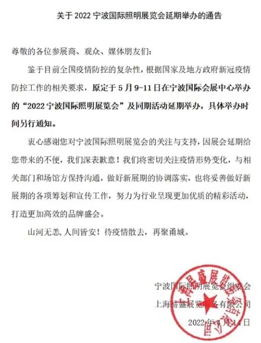 鑒于目前全國(guó)疫情防控的復(fù)雜性,根據(jù)國(guó)家及地方政府新冠疫情防控工作的相關(guān)要求,原定于5月9-11日在寧波國(guó)際會(huì)展中心舉辦的“2022寧波國(guó)際照明展覽會(huì)”及同期活動(dòng)延期舉辦,具體舉辦時(shí)間另行通知。