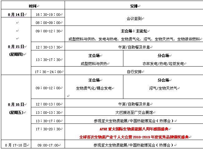 特邀贊助 答謝晚宴、全球生物質(zhì)千人大會(huì)、頒獎(jiǎng)盛典:12000元 報(bào)名參會(huì)收費(fèi)(閉門會(huì)議,謝絕來(lái)訪及攜帶人員) 4月12日-6月30日:2500元/人 7月1日-8月14日:2800元/人 現(xiàn)場(chǎng)報(bào)名:3000元/人 晚宴及頒獎(jiǎng)盛典:500元/人 以上參會(huì)費(fèi)用包含的服務(wù)有: 1、增值稅專用發(fā)票(發(fā)票類型:會(huì)議展覽服務(wù)費(fèi)或展會(huì)服務(wù)費(fèi)) 2、APBE8周年感恩答謝晚宴,全球首次生物質(zhì)產(chǎn)業(yè)千人大會(huì)暨2018-2019年度優(yōu)秀品牌頒獎(jiǎng)盛典名額1個(gè) 3、大會(huì)會(huì)刊1本(200元)、展會(huì)會(huì)刊1本(100元)——演講嘉賓PPT、國(guó)家政策、企業(yè)名錄等 4、參會(huì)證1張(峰會(huì))、參觀證1張(展會(huì))、自助午餐2份 5、參會(huì)企業(yè)列入大會(huì)會(huì)刊企業(yè)名錄(限時(shí)福利) 注:參會(huì)人員的住宿,交通自理 重磅推出——APBE會(huì)員單位:2000元/人(含發(fā)票) 會(huì)員福利: 1. APBE亞太生物質(zhì)展會(huì)員展示區(qū)免費(fèi)參展(1米*2米),位置優(yōu)先安排(限額60個(gè)先申請(qǐng)先安排) 2. APBE8周年答謝晚宴、全球生物質(zhì)產(chǎn)業(yè)千人大會(huì)暨品牌頒獎(jiǎng)盛典免費(fèi)名額1個(gè),非會(huì)員500元/人 3. APBE全國(guó)各區(qū)域會(huì)議免費(fèi)參加 4.列為APBE品質(zhì)供應(yīng)商,推薦給買家 5. APBE官網(wǎng)列為品質(zhì)供應(yīng)商(logo展示并鏈接到貴公司官網(wǎng)) 6. APBE平臺(tái)(官網(wǎng)、微信號(hào)、微信群等)會(huì)員介紹,包含文字、圖片及鏈接 7. APBE微信公眾號(hào)發(fā)布企業(yè)軟文5篇(軟文內(nèi)容由貴公司提供) 8. APBE亞太生物質(zhì)高峰論壇會(huì)刊,免費(fèi)刊登企業(yè)聯(lián)系方式、主營(yíng)產(chǎn)品 9. APBE亞太生物質(zhì)展會(huì)刊,免費(fèi)刊登企業(yè)介紹及聯(lián)系方式,展會(huì)會(huì)刊1本 10. APBE亞太生物質(zhì)展會(huì)員參展福利,滿10000減1000,并優(yōu)先安排展位. 11. APBE亞太國(guó)際生物質(zhì)高峰論壇會(huì)員優(yōu)惠2000元/人,原價(jià):3000元/人 12. APBE亞太國(guó)際生物質(zhì)高峰論壇會(huì)刊優(yōu)惠100元/本,原價(jià)200元/本(包郵) 九、贊助方案套餐 (1)演講贊助:13800元 1、會(huì)議發(fā)言20分鐘 2、彩頁(yè)廣告1P 3、3人免費(fèi)參會(huì)名額(含演講嘉賓) 4、公司標(biāo)志在大會(huì)論壇背景板出現(xiàn) (2)展位贊助:16800元 1、3m*2m展位1個(gè) 2、彩頁(yè)廣告1P 3、2人免費(fèi)參會(huì)名額 4、公司標(biāo)志在大會(huì)論壇背景板出現(xiàn) (3)冠名贊助:88000元 1、晚宴冠名(APBE 8周年答謝晚宴、全球生物質(zhì)產(chǎn)業(yè)千人大會(huì)暨品牌頒獎(jiǎng)盛典) 2、峰會(huì)列為金牌贊助單位 3、參會(huì)證、嘉賓證廣告 4、吊繩廣告 5、3m*2m標(biāo)準(zhǔn)展位2個(gè),主辦方搭建 6、企業(yè)代表分論壇20分鐘發(fā)言 7、5人免費(fèi)參會(huì)名額 8、彩頁(yè)廣告2P 9、晚宴播放宣傳片 10、嘉賓致辭 11、VIP嘉賓席1位 12、資料入袋 (4)特邀贊助:12000元 1、晚宴、峰會(huì)、展會(huì)主題版、門樓等列為支持單位 2、彩頁(yè)廣告1P 3、官網(wǎng)列為品牌企業(yè)全年展示 4、生物質(zhì)微信號(hào)底部廣告2個(gè)月 5、晚宴暨品牌盛典免費(fèi)出席名額2名 6、峰會(huì)嘉賓席席位1個(gè)(2800元/人) 十、APBE會(huì)務(wù)組聯(lián)系方式 總 部:廣州市黃埔區(qū)科學(xué)城科匯金谷三街4號(hào)4樓 國(guó)際部:廣州市黃埔區(qū)科學(xué)城科匯金谷一街7號(hào)3樓 總 機(jī):020-36657000/008 傳 真:020-36657099 官 網(wǎng):www.apbechina.com 官 網(wǎng):www.cnibee.com 國(guó)內(nèi)業(yè)務(wù)(參會(huì)、演講、贊助、晚宴) 聯(lián)系人:戚紫嫣 18617398169(統(tǒng)籌) 聯(lián)系人:鄧淑萍 13527794706 聯(lián)系人:周曉軍 15577303026 聯(lián)系人:李倩文 18620023689 聯(lián)系人:陳俊爵 18680293060 聯(lián)系人:鐘大釗 13533538565 聯(lián)系人:周堅(jiān)平 15975642556 國(guó)際業(yè)務(wù)(參會(huì)、演講、贊助、晚宴) 聯(lián)系人:Jenny 15876558395 聯(lián)系人:Sarah 13539992305 附:同期活動(dòng)、嘉賓介紹 十一、同期活動(dòng) 2019第15屆中國(guó)熱能博覽會(huì)暨清潔能源展 時(shí)間: 8月16 -18日 地點(diǎn):廣州•廣交會(huì)展館 規(guī)模:13萬(wàn)平方米,2000+展商 地鐵:8號(hào)線新港東站A出口 生物質(zhì)能專題: 2019亞太國(guó)際生物質(zhì)能展 2019亞太國(guó)際生物質(zhì)燃料與發(fā)電展 2019亞太國(guó)際垃圾處理與發(fā)電展 2019亞太國(guó)際沼氣及生物液體燃料展 中國(guó)熱博會(huì)專題: 2019中國(guó)國(guó)際(廣州)鍋爐及熱力系統(tǒng)展 2019中國(guó)國(guó)際(廣州)熱泵技術(shù)及設(shè)備展 2019中國(guó)國(guó)際(廣州)烘干及干燥設(shè)備展 2019亞太熱水科技博覽會(huì) 2019廣州國(guó)際太陽(yáng)能展 2019年8月16-18日,敬請(qǐng)移步,蒞臨參觀! 十二、嘉賓回顧(部分) 1、歐洲木質(zhì)顆粒委員會(huì)(EPC)主席 克里斯蒂安•雷克斯 2、新西蘭生物能源協(xié)會(huì)(BANZ)執(zhí)行董事 布萊恩先生 3、英國(guó)國(guó)際貿(mào)易部可再生能源中心廢物和資源領(lǐng)域?qū)<?nbsp; 黛博拉•薩克斯 4、馬來(lái)西亞生物質(zhì)工業(yè)聯(lián)合會(huì)(MBIC)秘書長(zhǎng) Michael Sew 5、馬來(lái)西亞生物質(zhì)工業
